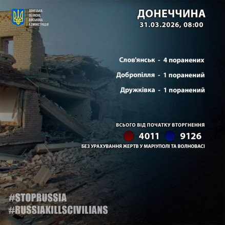 Як повідомляв Укрінформ, 30 березня російські військові завдали авіаудару по центральній частині Слов'янська, внаслідок чого зазнав пошкоджень єдиний на Донеччині пологовий будинок.