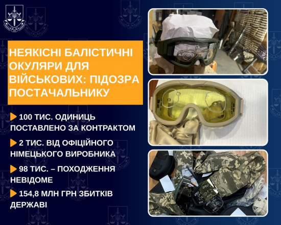 Правоохоронці оголосили підозру директору приватного підприємства за постачання Міністерству оборони неякісних балістичних окулярів-масок для військових на 154,8 млн грн.