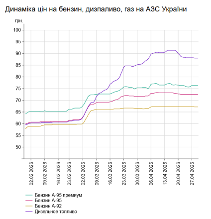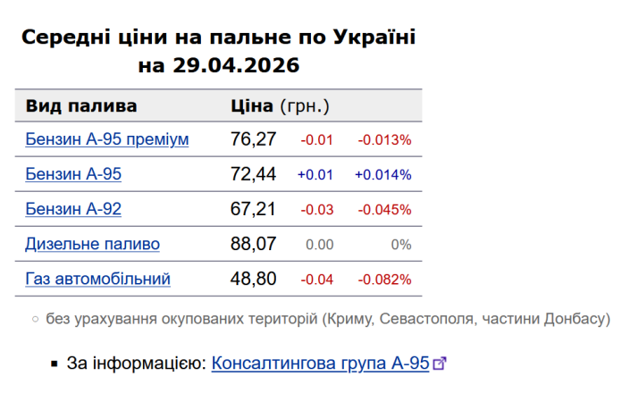У середу, 29 квітня, середня ціна на бензин марки А-95 зросла на 1 коп. до 72,44 грн/л, на дизельне пальне — зафіксувалася на рівні 88,07 грн/л.