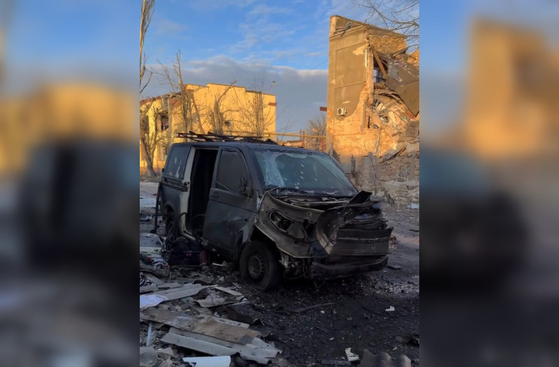 На фото: знищений евакуаційний бус волонтера Боксера. Берислав, 4 лютого 2026 року. Скриншот відео: інстаграм/andry_boxer