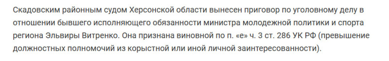 Ексчиновниці Херсонської ОДА Ельвірі Вітренко, яка під час окупації Херсона пішла на співпрацю із загарбниками, нині окупанти винесли вирок за розтрату 11 млн рублів під час її перебування на посаді так званої «міністерки спорту Херсонщини».