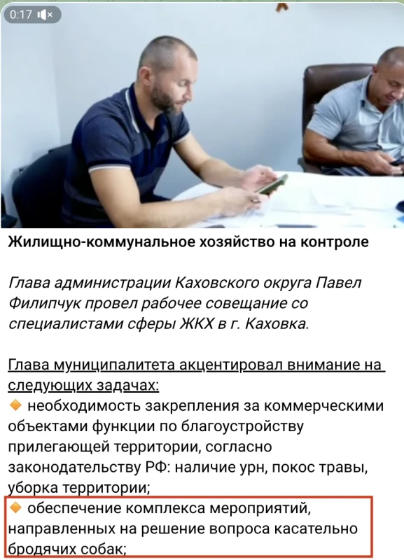 Псевдокерівник тимчасово окупованого міста Каховка Павло Філіпчук понад два роки не може розв’язати проблему великої кількості бродячих тварин у місті. У своїх соціальних мережах Філіпчук розповів, що провів чергову нараду, на якій підіймали питання нападу бродячих собак на мешканців Каховки.