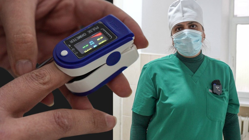 Медикиня демонструє роботу пульсоксиметра, який вимірює рівень кисню у крові пацієнта. Суспільне Херсон