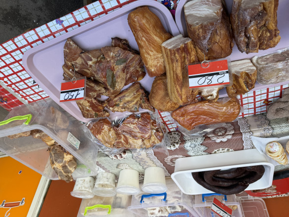 "Піднялись ціни на продукти. Людям звісно трішки важкувато. Але все-одно, по-трошку, але беруть. Домашня ковбаса — 450, корейка – 280, 150 – ребра, балик копчений домашній по 350, по 300 — сало солоне домашнє, кров’яночка. Беруть люди по-тихеньку".