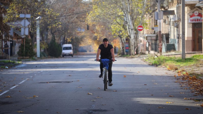 Навіть вдень на дорогах немає жвавого автомобільного руху. Містом можна неквапливо проїхатись на велосипеді. Втім важливо залишатися пильними й прислухатись до дронів, які військові РФ запускають з лівого берега. Суспільне Херсон