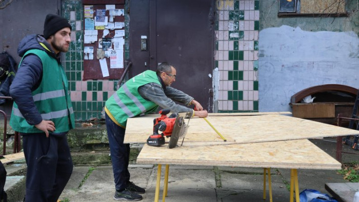 Працівники комунальної служби працюють на місці чергової атаки РФ. OSB-плити — тимчасовий, але дієвий спосіб закрити розбиті вікна в оселях херсонців. Суспільне Херсон/Олександр Корняков