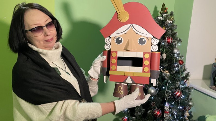 Елла Громова показує іграшку з новорічної колекції музею. Херсон, грудень 2025 року. Суспільне Херсон