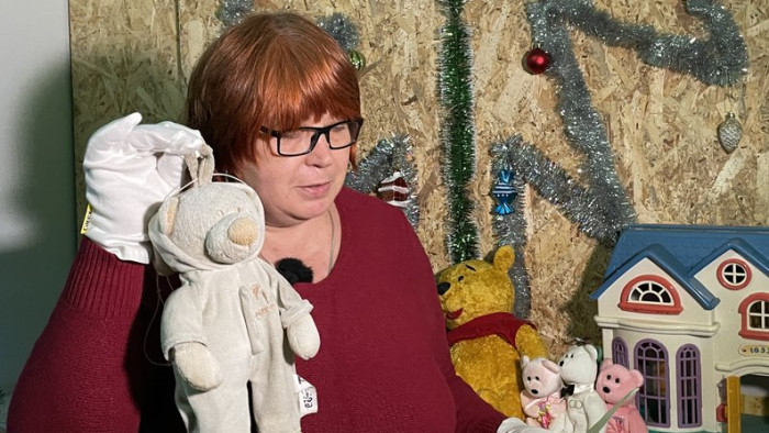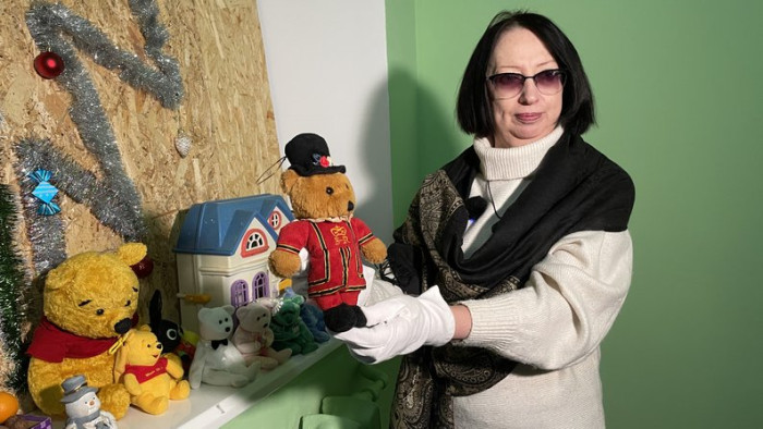 Співробітниця музею Вікторія Філенко показує ведмедика, який потрапив до музею після обстрілу у Херсоні, грудень 2025 року. Суспільне Херсон