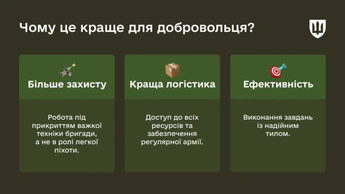 У Міноборони підкреслили, що переважна частина легіонерів тепер інтегрується до лінійних бригад, отримуючи кращу зброю, захист та доступ до важкої техніки, а вузькопрофільні фахівці працюватимуть за фахом у профільних ротах.