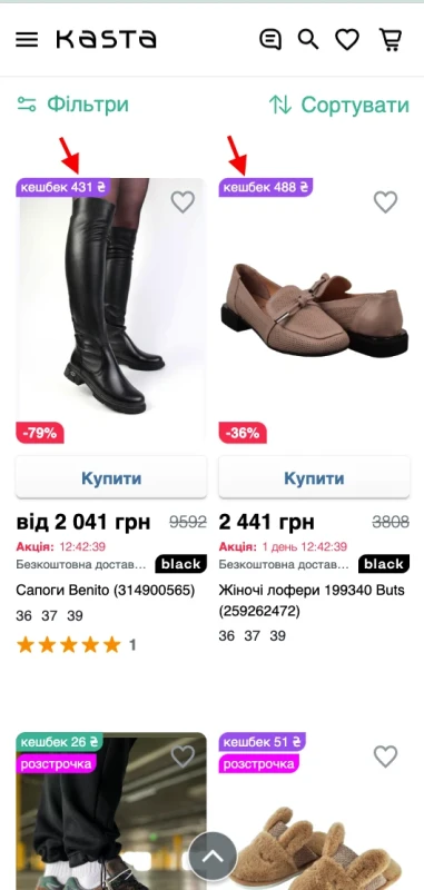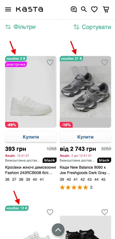 Кешбек на Kasta – це свобода вибору. Накопичуйте бонуси на повсякденних покупках (побутова хімія, одяг, техніка) і витрачайте на щось особливе: нову сукню, гаджет чи подарунки до свят. Під час Чорної п’ятниці чи сезонних розпродажів підвищений бонус до 30% дозволяє економити ще більше. Наприклад, купуючи кросівки за 2000 грн із кешбеком 20%, ви отримуєте 400 грн назад. Навіть після покупки за бонус нараховується новий!