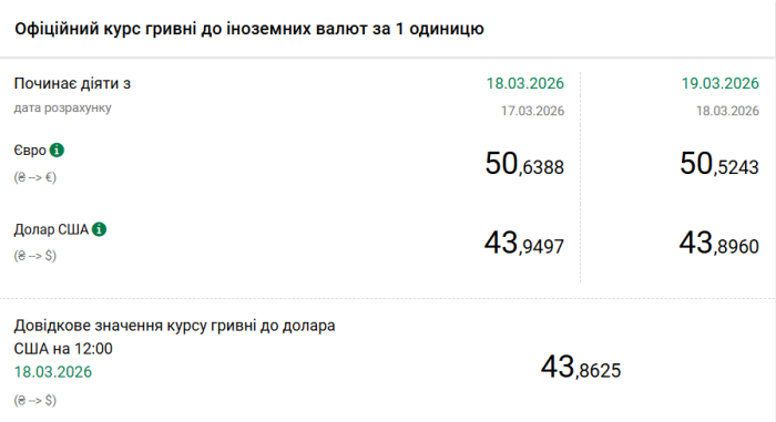 1 долар США – 43,89 грн (43,94 грн станом на 18 березня);