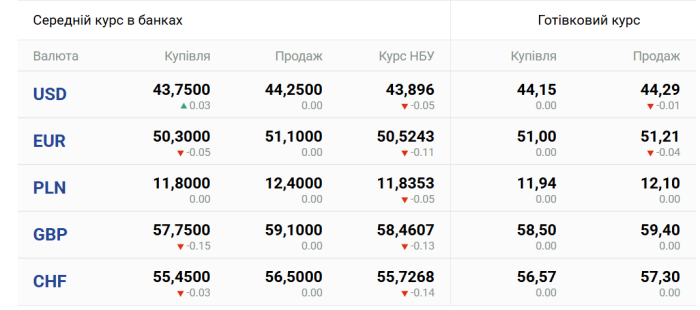 у monobank: 43,76 – 44,23 грн/$ та 50,32 – 50,96 грн/EUR.