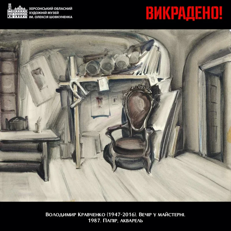 Роботу херсонського митця Володимира Кравченка ідентифікували серед експонатів, що викрадені росіянами та знаходяться у Центральному музеї Тавриди в окупованому Криму. Акварель 1987 року під назвою «Вечір у майстерні» була помічена на фотографіях, опублікованих у березні 2026 року за результатами візиту окупаційних чиновників до сімферопольського закладу.