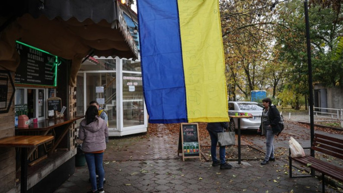 Та попри все Херсон живе. Вже три роки під постійними обстрілами, але з вірою у перемогу. На фото — прапор з привітанням до Дня визволення біля кіоску з кавою, Херсон, 11 листопада 2025 року. Суспільне Херсон/Олександр Корняков