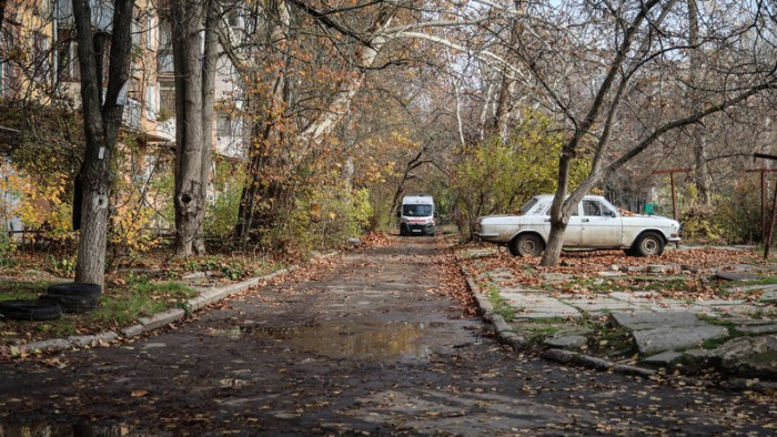 Щодня через атаки росіян гинуть та травмуються люди. Лише за тиждень, за даними МВА, у Херсонській громаді загинула людина, 25, зокрема дитина, — отримали поранення. На фото — авто швидкої допомоги у херсонському дворі, листопад 2025 року. Суспільне Херсон/Олександр Корняков