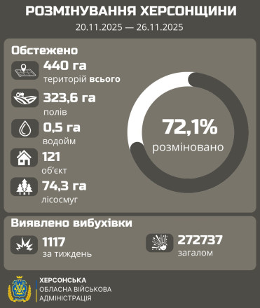 Відповідно до інфографіки, наразі розміновано 72,1% деокупованої території.