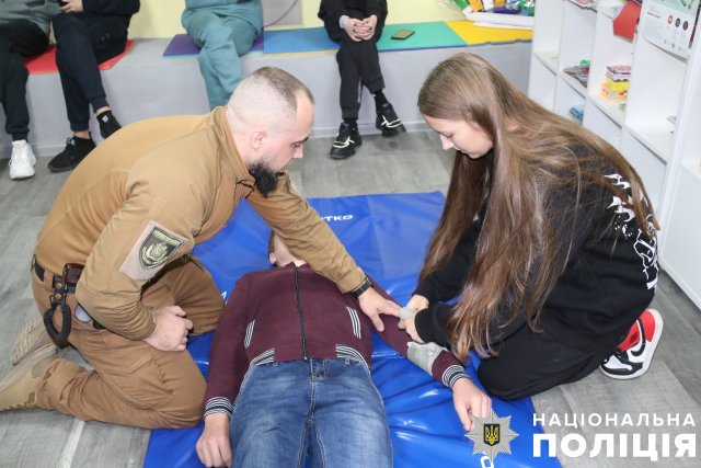 Спочатку поліцейські пояснили старшокласникам, наскільки важливо в умовах війни та періодичних обстрілів їх громади знати основи надання домедичної допомоги, які рятують життя постраждалого. Діти дізналися, як ефективно надати домедичну допомогу, коли треба діяти швидко і немає можливості одразу доправити людину до медзакладу.