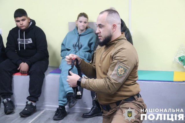 Аби учні завжди були підготовлені до будь-яких ситуацій, поліцейські подарували їм турнікети, надані представниками благодійної організації «Medical Aid and Rescue Service». Kateryna