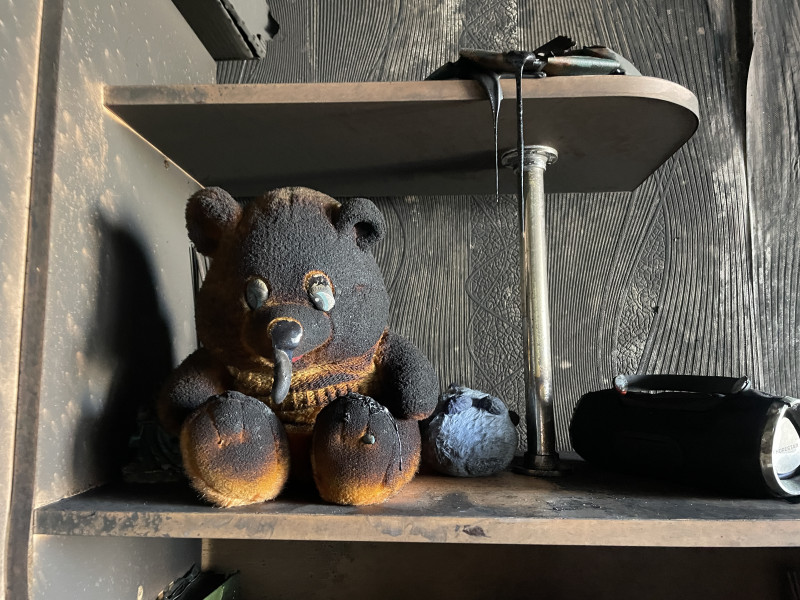 Обгоріла дитяча іграшка на полиці в квартирі, яка загорілась внаслідок російської атаки, Херсон, квітень 2026 року. Суспільне Херсон