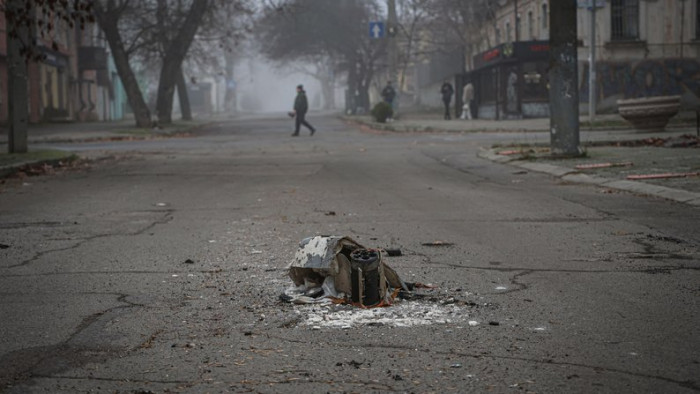 Російський снаряд посеред дороги у середмісті Херсоні, грудень 2025 року. Суспільне Херсон/Олександр Корняков
