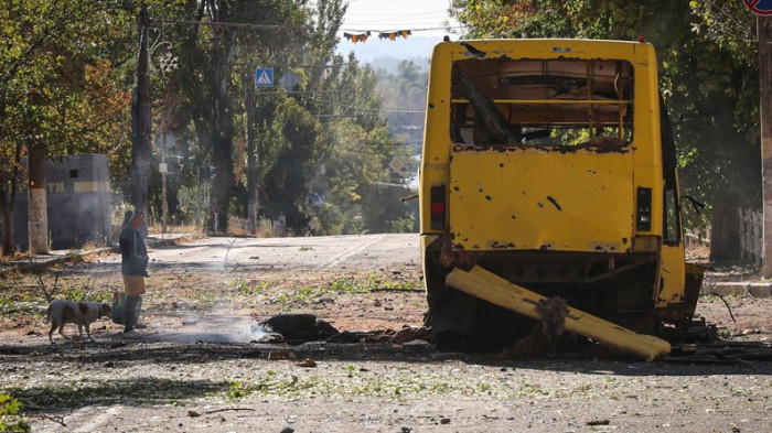 Жінка з собакою біля пошкодженої снарядами маршрутки після чергового обстрілу Херсона, вересень 2025 року. Суспільне Херсон/Олександр Корняков