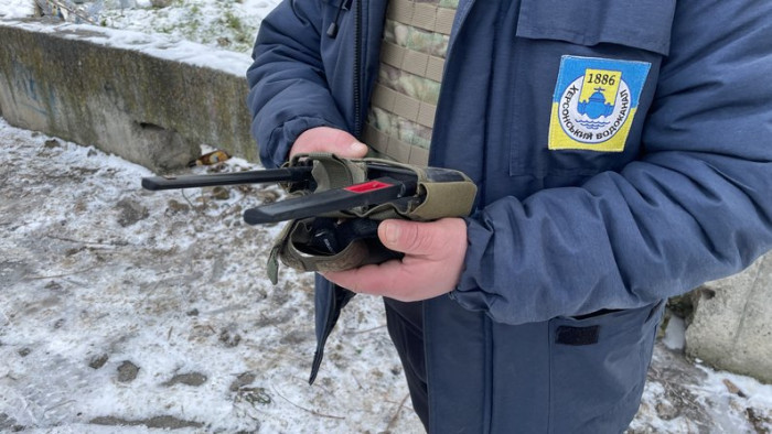 Спеціаліст водоканалу з детектором дронів у руках. Херсон, лютий 2026 року. Суспільне Херсон