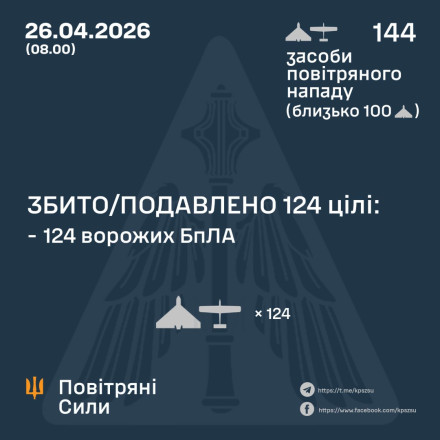 Сили протиповітряної оборони з вечора 25 квітня знешкодили 124 російські безпілотники зі 144 запущених.