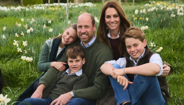 На фото Вільям, Кетрін разом із трьома їхніми дітьми – принцом Джорджем, принцесою Шарлоттою і принцом Луї – сидять на зеленій траві поміж нарцисів.