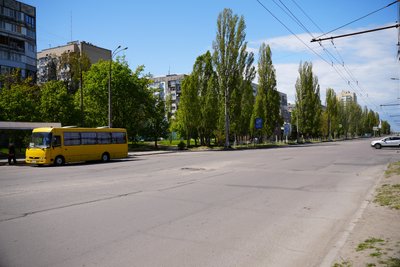 Зупинка громадського транспорту на проспекті у Центральному районі Херсона, квітень 2026 рік. Суспільне Херсон