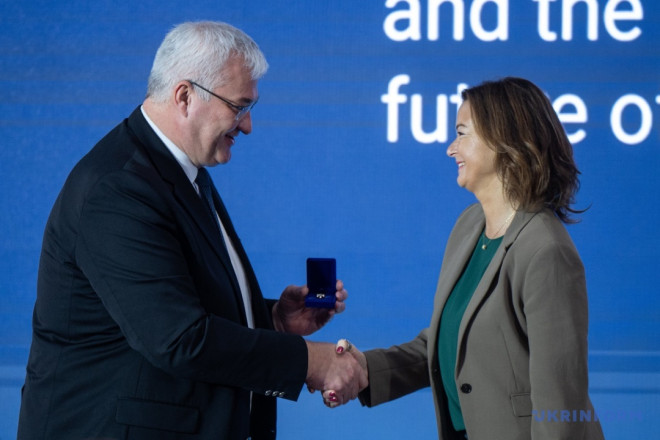 «За той внесок, який наша колега зі Словенії внесла у нашу стійкість, маю честь вручити нашу особливу відзнаку «Бурштинове серце»», — сказав Сибіга.