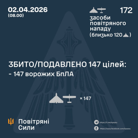 За попередніми даними, станом на 08:00 четверга, 2 квітня, ППО збила / подавила 147 ворожих дронів інших типів на півночі, півдні та сході України.