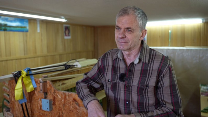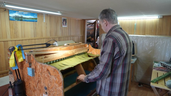 "Тут робляться основи для сіток. Кожна сітка має розмір 6 на 4 метри. Я виготовляю основу й передаю її вже готову тим, хто буде її плести", — пояснює Олег.