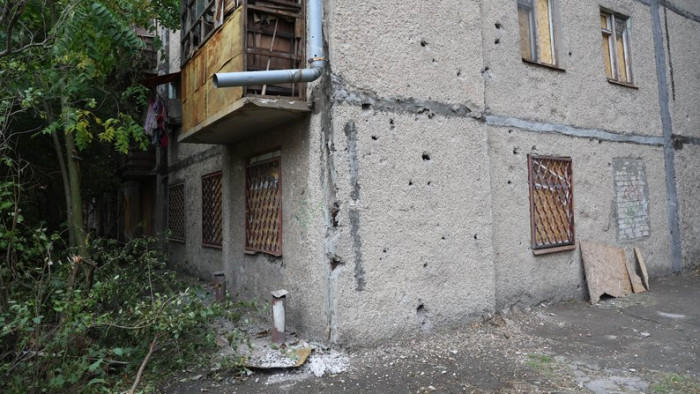 Побита осколками російських снарядів стіна багатоквартирного будинку у середмісті Херсона, жовтень 2025 року. Суспільне Херсон/Олександр Корняков