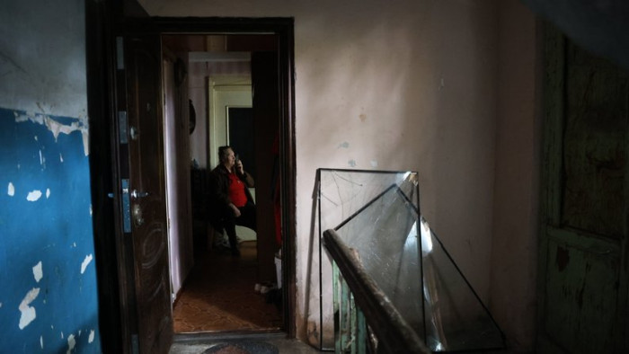 Жителька обстріляного російськими військами будинку у середмісті говорить телефоном, Херсон, жовтень 2025 року. Суспільне Херсон/Олександр Корняков