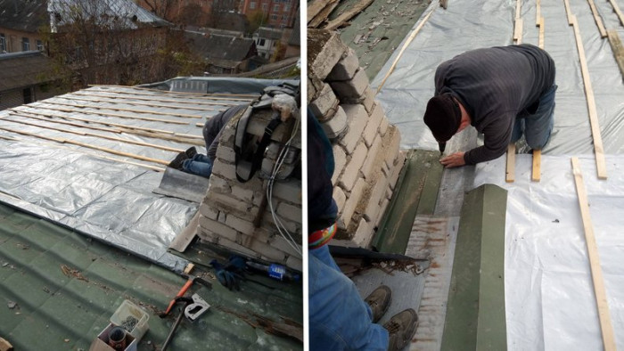 Пошкоджений російськими обстрілами дах закривають плівкою. Фото надав Олег