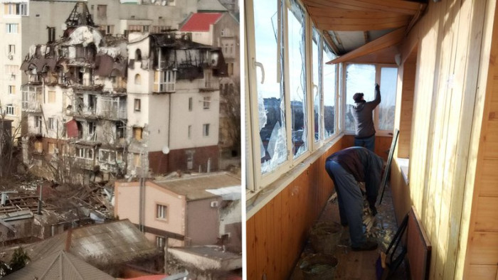 Ремонт фасаду будинку, який опинився під ударом РФ. Фото надав Олег