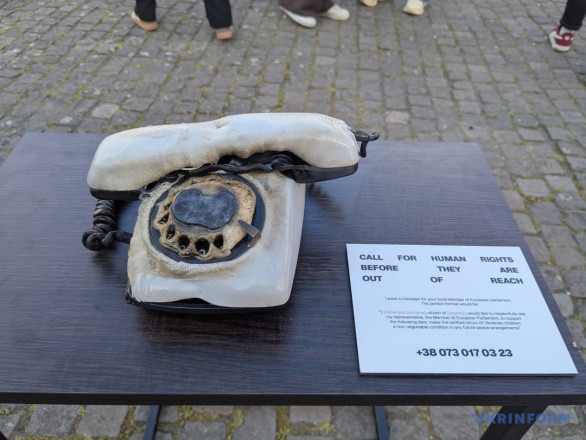 У центрі інсталяції — робочий телефон, за допомогою якого громадяни можуть безпосередньо зателефонувати до Європейського парламенту та вимагати повернення викрадених українських дітей.