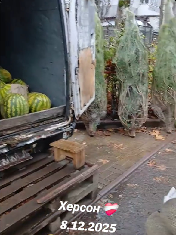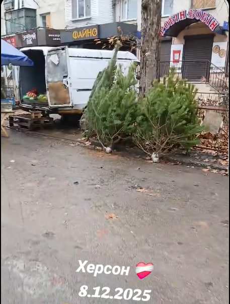 Ялинки в Шуменському мікрорайоні 10 грудня 2025 р. Фото надані «Гривні» жителькою ХерсонаТож незламний Херсон, попри все, потроху готується до різдвяно-новорічних святкувань – з ялинками й кавунами.
