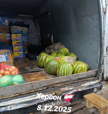 Саме таку картину херсонці зафіксували 8 грудня на Дніпровському ринку – відео в одній із соцмереж виклала херсонка Олена Щербина. З вантажного бусика містянам пропонують різноманітні овочі та фрукти, серед яких – навіть кавуни. Звісно, у грудні їхній смак уже не той, тому й ціна відповідна – 10 гривень за кілограм.