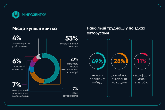 Такі дані всеукраїнського опитування пасажирів міжнародних автобусних перевезень оприлюднило Міністерство розвитку громад та територій, передає Укрінформ.