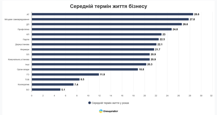 А ось найменший строк життя виявився у благодійних організацій: 5 років, обслуговуючих кооперативів — 7 років 5 місяців та ТОВ — 8,5 років.
