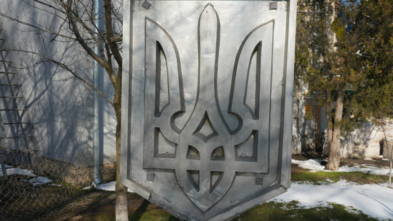 Вцілілий герб України з будівлі Херсонської ОДА. Херсон, лютий 2026 року. Суспільне Херсон