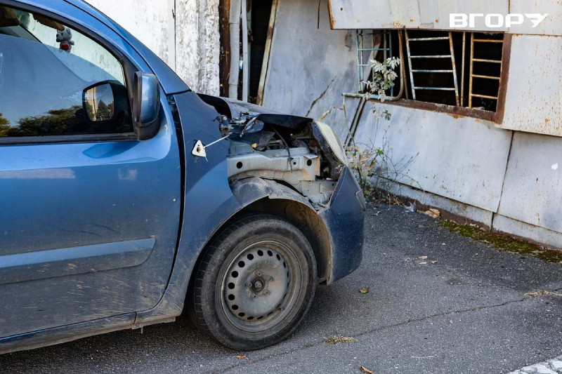 Пошкоджене авто комунальних служб та автівка, надана волонтерами. Фото Олександра Андрющенка / ”Вгору”