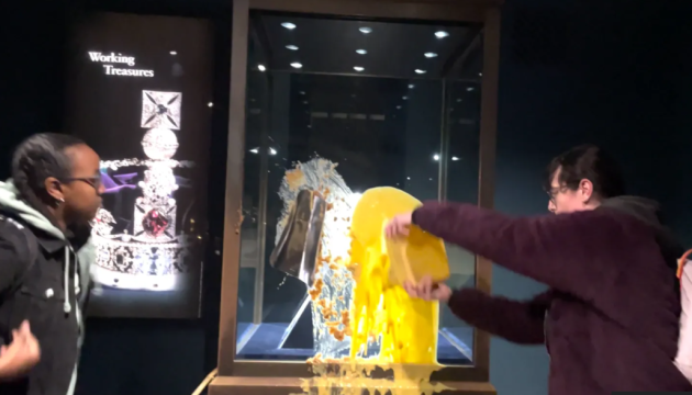 У Великій Британії затримали чотирьох осіб після того, як у вітрину Лондонського Тауера, де зберігається частина королівських коштовностей, кинули яблучний крамбл і заварний крем.