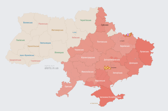 Актуальна мапа повітряних тривог станом на 02:20 / Джерело: https://alerts.in.ua/