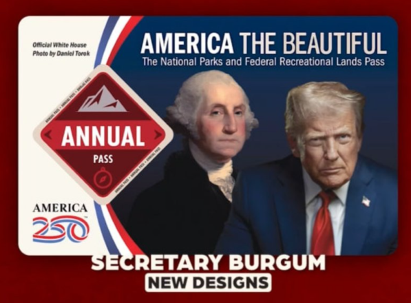 Міністерство внутрішніх справ, яке контролює національні парки США, нещодавно оголосило про презентацію «нових пам’ятних дизайнів» для перепусток відвідувачів у парки, на одній з яких зображено обличчя Дональда Трампа разом із Джорджем Вашингтоном.