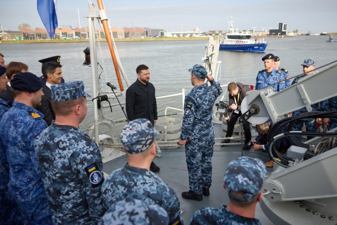 Президент Володимир Зеленський та премʼєр-міністр Нідерландів Роб Єттен провели зустріч з українськими військовими, які навчаються на протимінному кораблі класу Alkmaar. Нідерланди повністю підготують екіпаж та передадуть Україні корабель у червні.