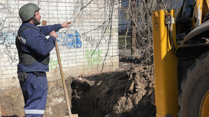 Андрій Дербушев працює під час усунення витоку біля розкопу. Херсон, березень 2026 року. Суспільне Херсон