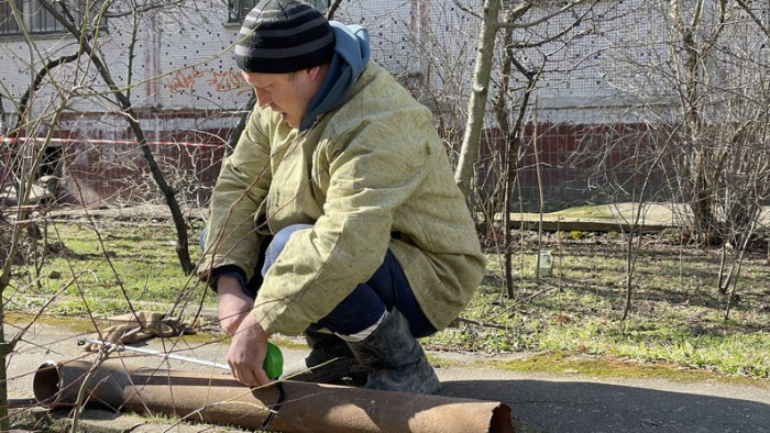 Євген Куліченко робить заготовку для заміни ділянки труби. Херсон, березень 2026 року. Суспільне Херсон