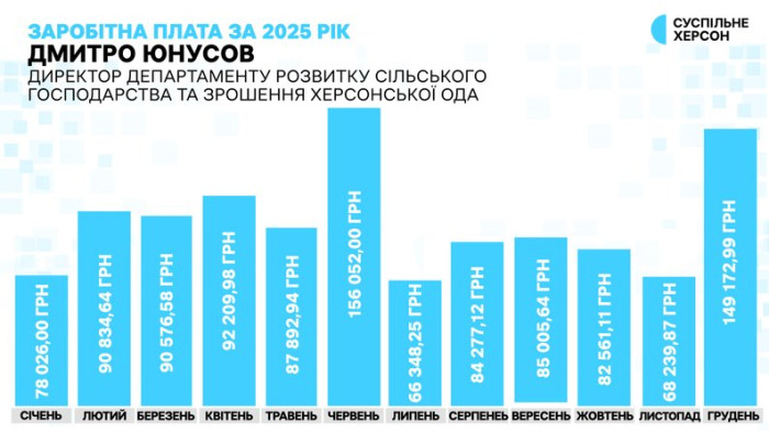 Заробітна плата директора розвитку сільського господарства та зрошення Херсонської ОДА Дмитра Юнусова за 2025 рік помісячно. Інфографіка Суспільне Херсон